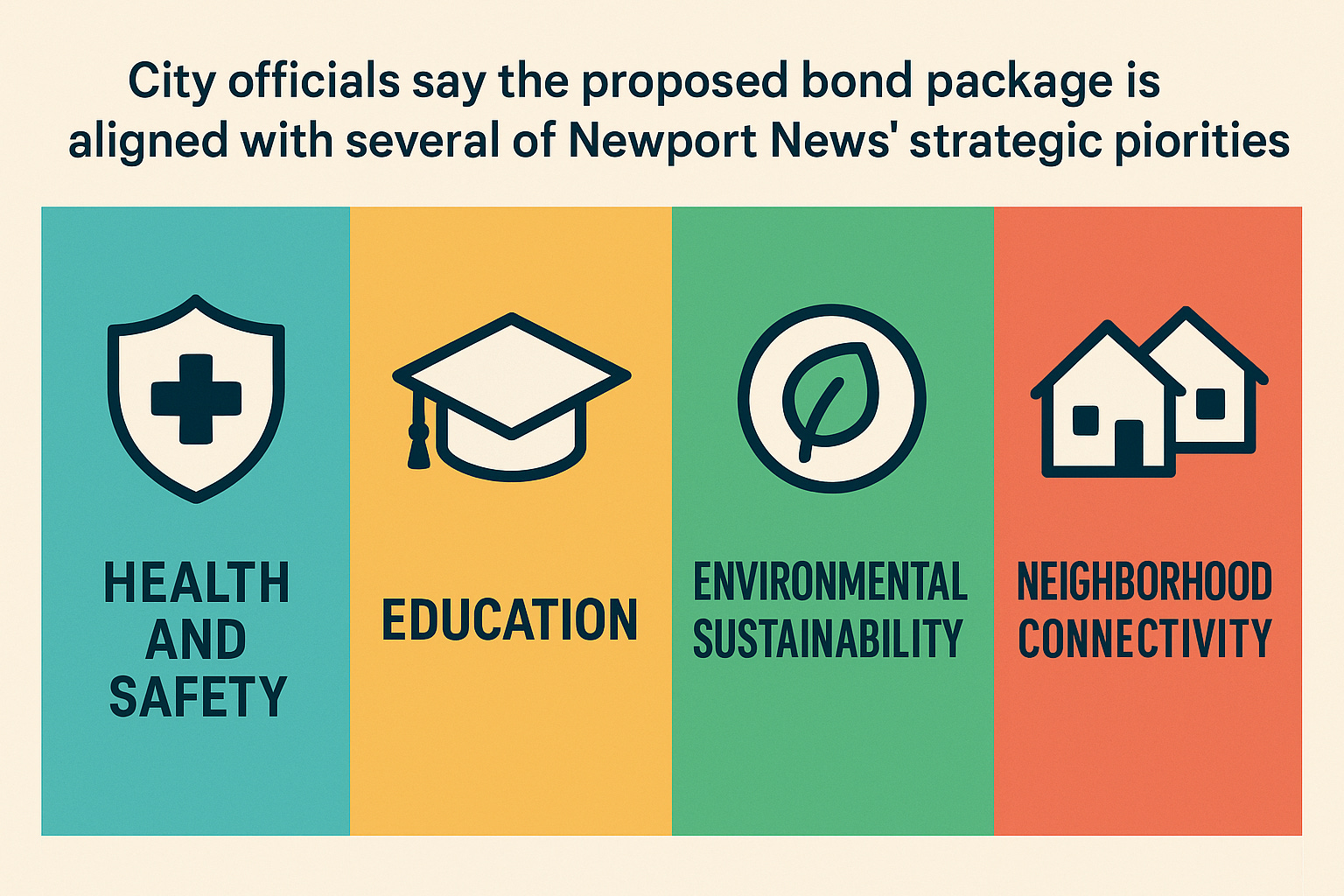 City officials say the proposed bond package is aligned with several of Newport News’ strategic priorities, including health and safety, education, environmental sustainability, and neighborhood connectivity. The bonds would be issued as general obligations backed by the City’s full faith and credit, and repaid through future tax revenue.